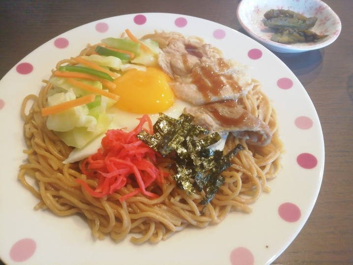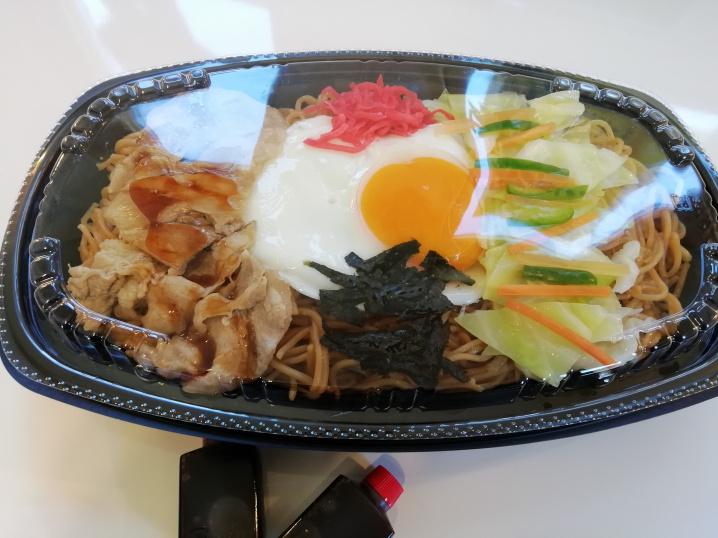 焼きそばの上には半熟卵がトッピングしてあり、ソースなしでもヘルシーに卵と絡めて食べても美味しいです。お好みでソースをかけて食べると焼きそばとソースがいい感じに口の中で広がります☺